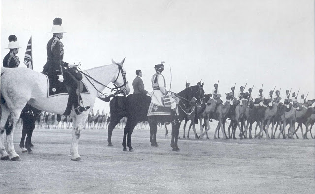 | Raja Ganga Singh dari Kerajaan Bikaner (tengah; berkuda) menyambut kunjungan Gubernur Jenderal Lord Linlithgow bersma pasukan kavaleri Kerajaan Bikaner tahun 1937. |